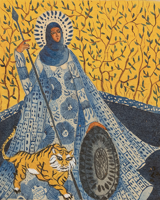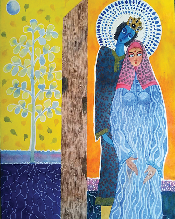 যখন পশ্চাৎপট নকশা, তখন তার কাজে প্রতিকৃতি রূপান্তরিত হয়েছে উদ্যানে। পদ্মের মধ্যেও এসেছে হাওয়াবিবি। লোকজ ষষ্ঠী থেকে দূর্গা–সকলেই হাওয়াবিবি তত্ত্বে ঢুকে পড়েছে। এ অঞ্চলের ইতিহাসের রূপান্তরকে তিনি হাওয়াবিবির মোটিফের মতোই স্বাভাবিকীকরণের মধ্যে উপস্থাপন করেছেন। কোনো আকস্মিকতা নেই ছবিতে। উজ্জ্বল রঙের ব্যবহারে জ্বলজ্বল করছে তার চিত্রতল। অথচ ছবির ভাষ্য ভঙ্গুর নয়, ভঙ্গুর নয় ভাষাও।